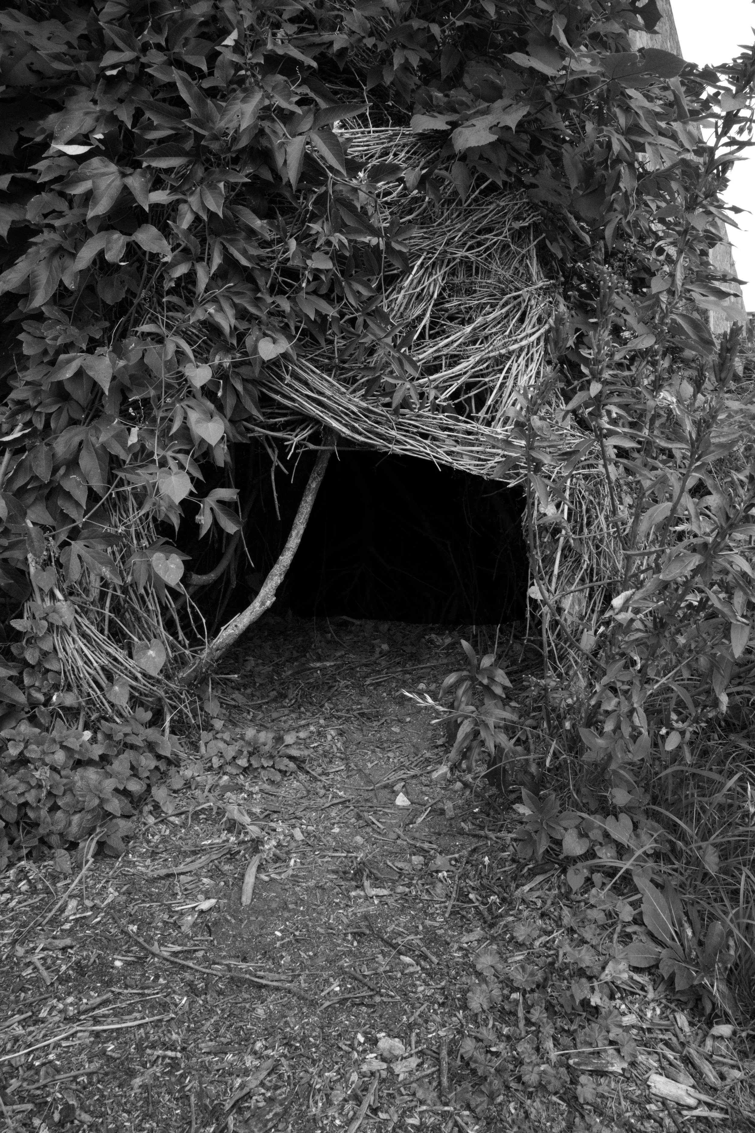 The park overall has an inviting presence to it. The hole has an entirely opposite effect. It gives off a feeling of fear and dread the closer you draw near it. The leaves that surround the hole are beautifully enticing, but the twigs surrounding it are almost unappealing. The twigs are perfectly placed, leaving room for a desire to touch it. The lonely, long stick that is holding the structure up, is holding onto dear life.